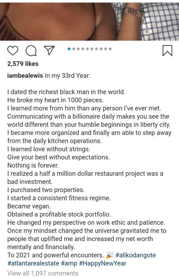 The controversial year 2020 ended with more drama as Atlanta based lady called Bea Lewis claimed the Richest Blackman Aliko Dangote broke her heart in 1000 pieces.
