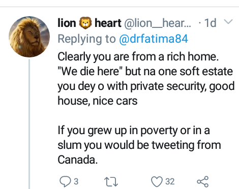 “Clearly you are from a rich home. “We die here” but na one soft estate you dey o with private security, good house, nice car. If you grew up in poverty or in a slum you would be tweeting from Canada.” one commented under her tweet.