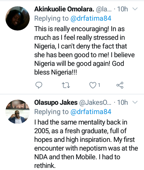 In a time when many Nigerians are searching for ways to leave the country, a Nigerian doctor identified as Fatima has disclosed that she turned down an opportunity to move to Canada because she wants to contribute to the betterment, growth and development of her country.